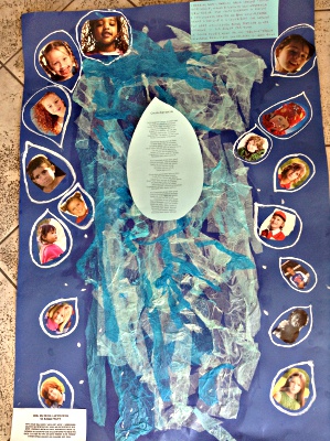 Nel cartellone si vedono tante gocce che fuoriescono da uno scroscio d'acqua centrale realizzato con collage di carta velina.